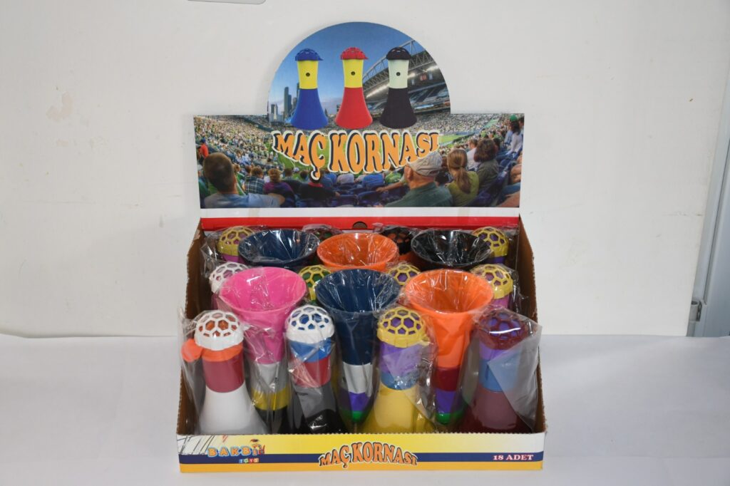 Dükkan önü ve tezgahlar için en çok satan taraftar ürünü! 18 adetli özel teşhir standında, büyük boy, karışık renkli manuel maç kornası.