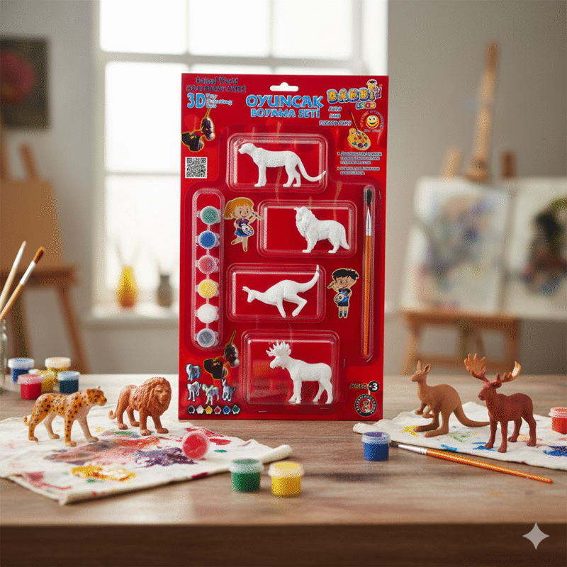 Çocuklarınızın yaratıcılığını ve el becerilerini geliştirecek, eğlence dolu bir maceraya hazır olun! BAKBİ Hayvanlar Alemi 3D Oyuncak Boyama Seti (Geyik Serisi), 3 yaş ve üzeri minik sanatçıların kendi hayvan figürlerini tasarlamasına olanak tanır. Bu set, çocukların hem sanatsal yönlerini keşfetmesini sağlar hem de saatlerce süren keyifli ve eğitici bir aktivite sunar. Paket içeriğinde geyik, leopar, aslan ve kanguru gibi birbirinden farklı dört adet beyaz 3D hayvan figürü bulunmaktadır.