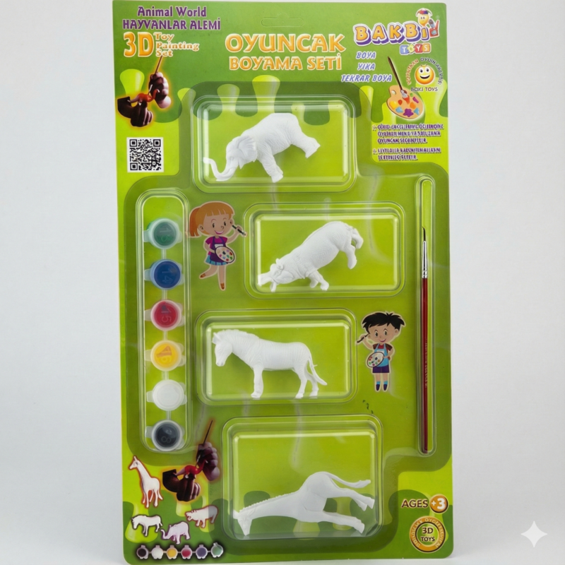 Çocuklarınızı, egzotik hayvanların renkli dünyasına davet edin! BAKBİ Hayvanlar Alemi 3D Oyuncak Boyama Seti (Zürafa Serisi), 3 yaş ve üzeri çocukların yaratıcılıklarını en sevilen büyük hayvan figürleri üzerinde sergilemelerini sağlar. Bu seri, fil, gergedan ve iki farklı at figürü (veya paketteki diğer benzer dört ayaklı figürler) dahil olmak üzere dört adet detaylı, boyamaya hazır 3D hayvan figürü içerir. Not: Görseldeki figürler fil, gergedan ve iki at figürüne benzemektedir, serinin adı Zürafa olsa da içerik bu figürlerden oluşmaktadır.